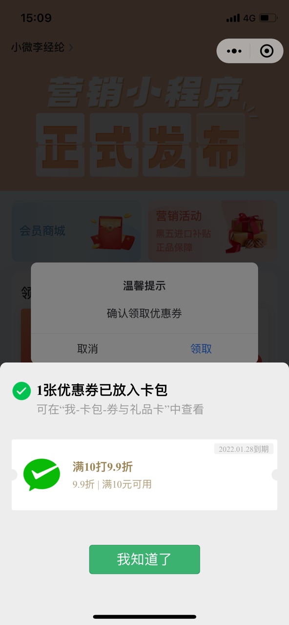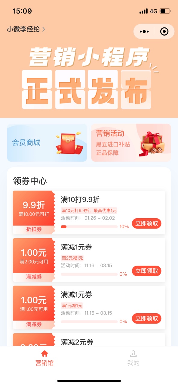展示后台创建的「营销活动」,进入活动页面可以直接领券