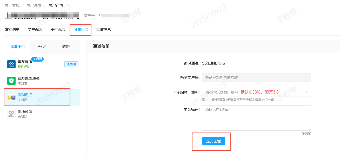 操作流程:商户管理——商户列表——商户详情——通道配置——乐刷通道(提交创建乐刷时,乐刷商户费率默认填写0.38%(即万38))
